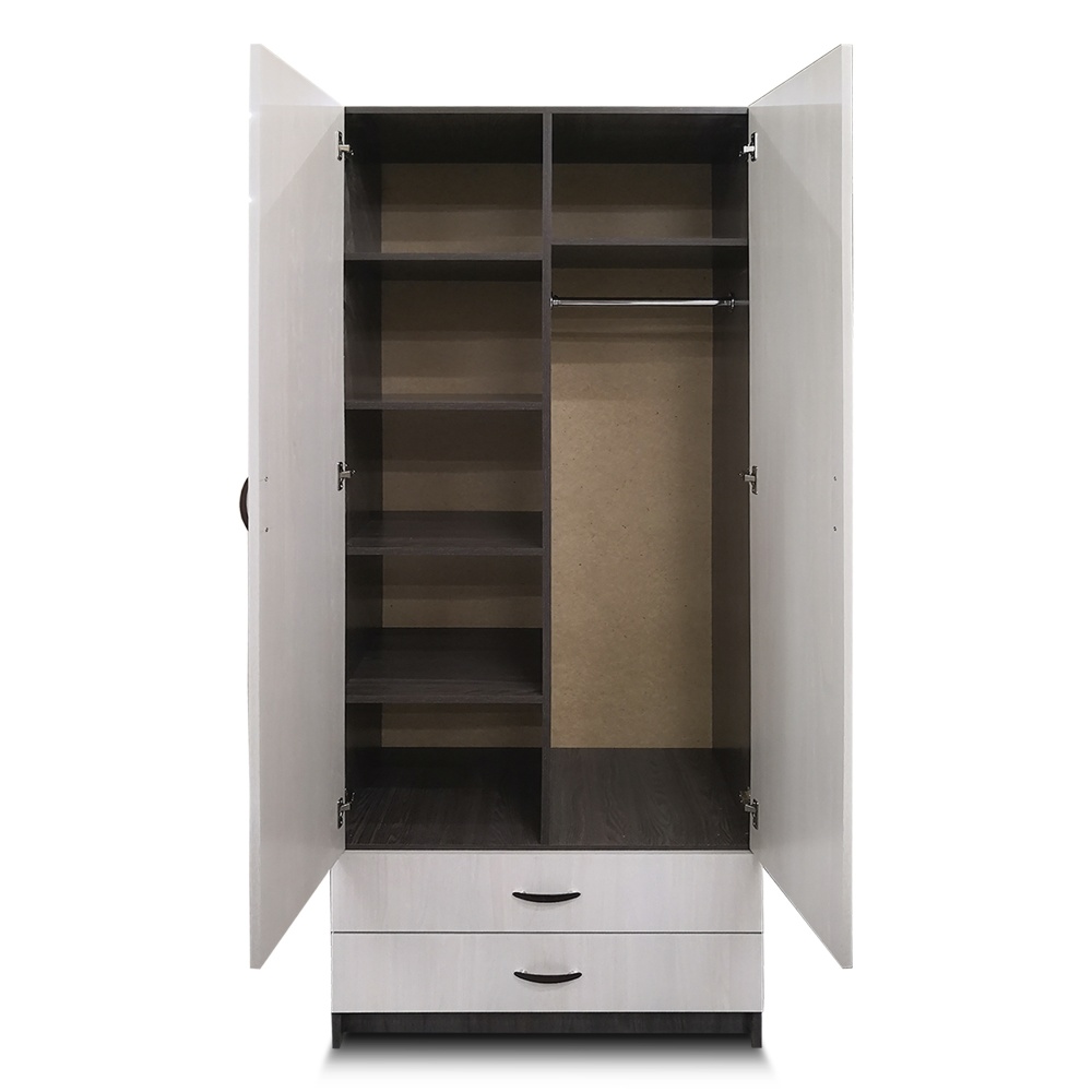• Внутри шкафа: 2 отдела — 1 отдел со штангой (+1 полка) и 1 отдел с 5 полками, 2 ящика